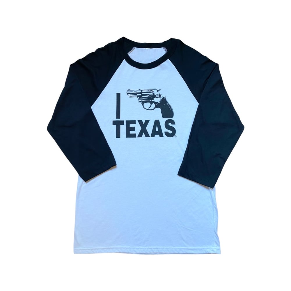 "I Bang Texas" screen printed on a white baseball tee with black sleeves, cotton/poly blend.